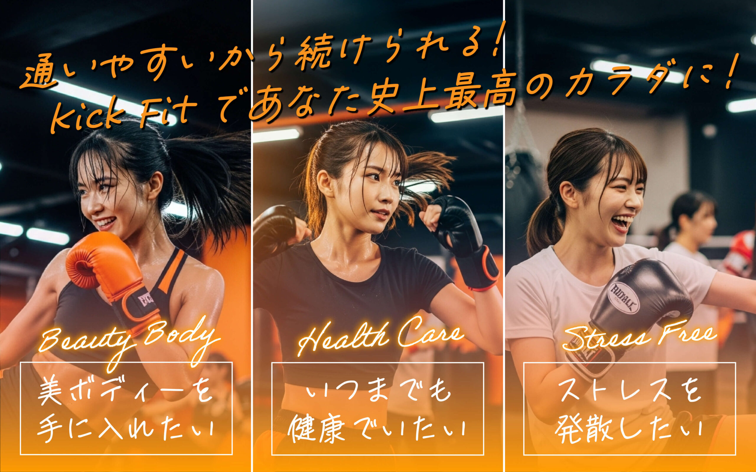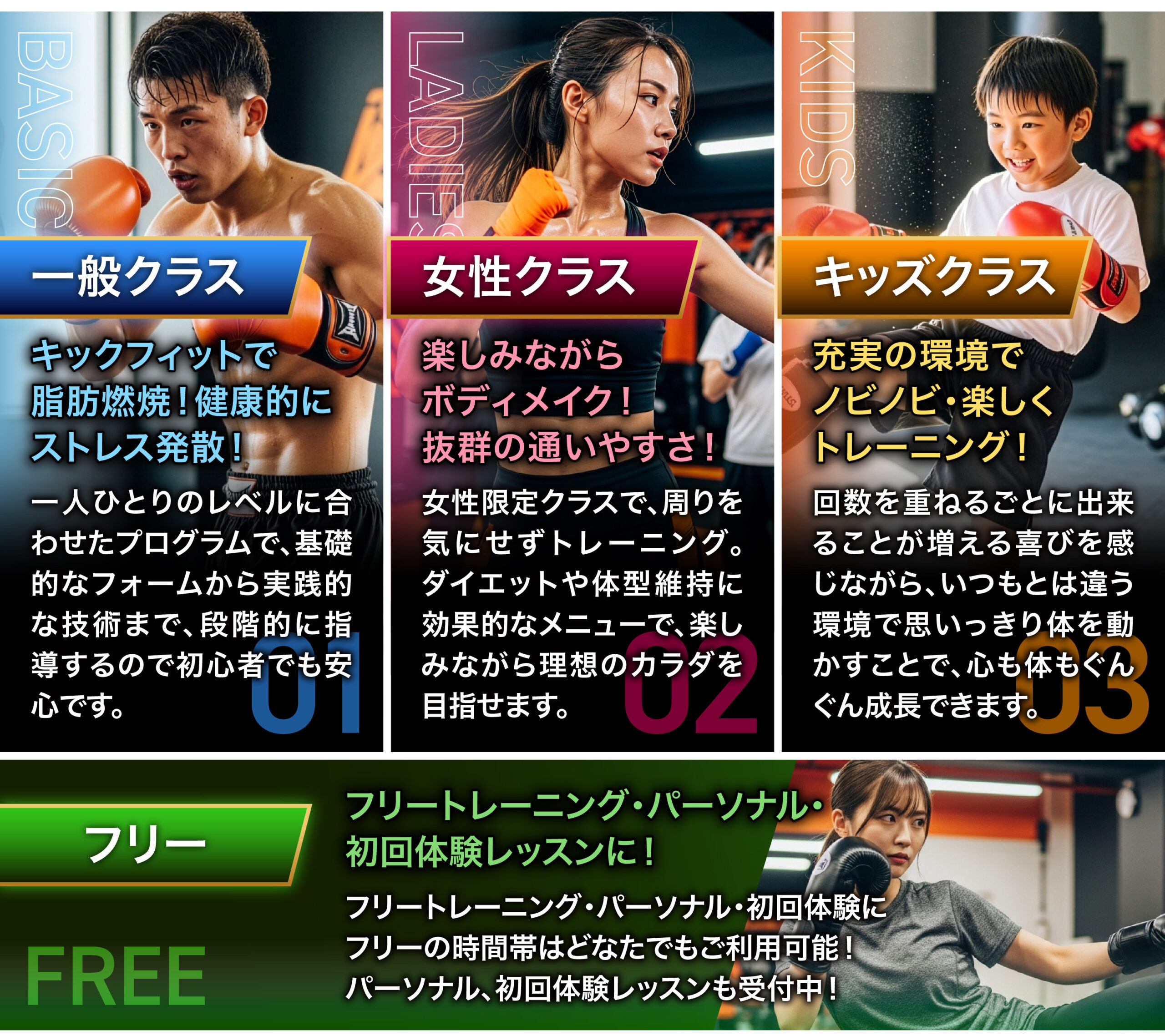 | レディースKICKFIT | 月・金13:00〜14:30 水16:00〜17:30 土19:00〜20:30 |