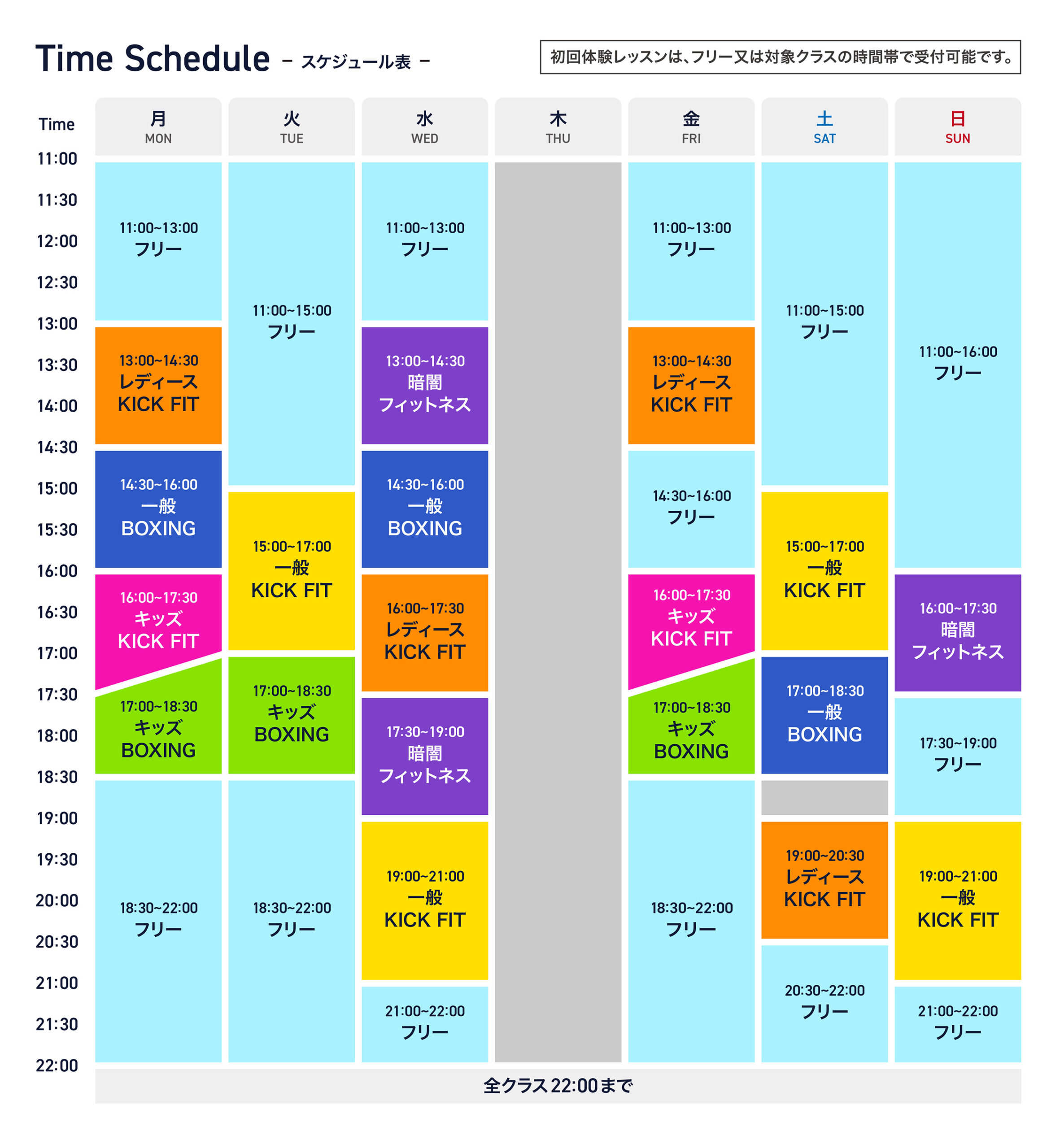 | 一般KICKFIT | 火・土15:00〜17:00 水・日19:00〜21:00 |